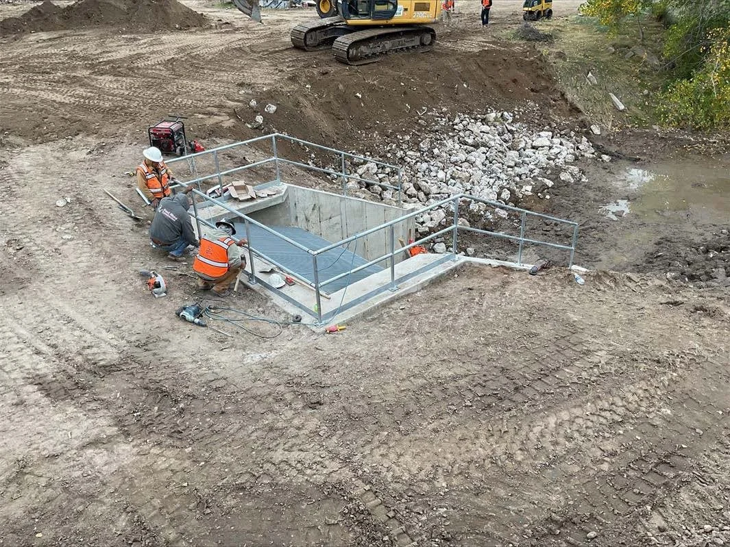 Crew installing the railing around the impact basin.